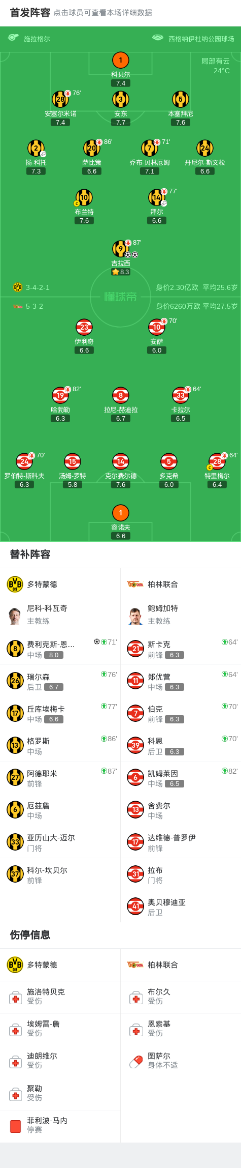 8月31日德国足球顶级联赛第2轮,多特蒙德主场迎战柏林联合。比赛进行到第44分钟,扬-科托送出助攻,吉拉西成功破门,为球队首开纪录。易边再战,第58分钟,拜尔助攻吉拉西再入一球,帮助球队扩大领先优势。比赛接近尾声时,第81分钟,费利克斯-恩梅加挺身而出,攻入锁定胜局的一球。最终多特蒙德以3比0战胜柏林联合。